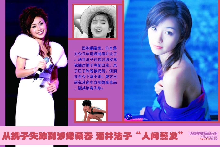 中新網本周熱點人物之酒井法子——8月7日“日本新華僑報網”最新報道,東京都警視廳當日上午向檢方申請批準逮捕狀,要對至今仍然下落不明的女星酒井法子實施逮捕,其理由是涉嫌違反《興奮劑取締法》。酒井法子在8月3日爆出母子“失蹤”,在8月6日又傳出其長子在朋友家中平安無事,更引起警方懷疑。現在,警方將把搜尋下落不明的酒井法子改為追捕下落不明的酒井法子。