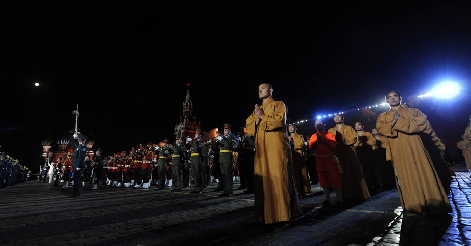 9月4日晚,在俄羅斯莫斯科紅場舉行的俄羅斯國際軍樂節開幕前夕的總彩排上,中國少林武僧亮相并進行了精彩表演。