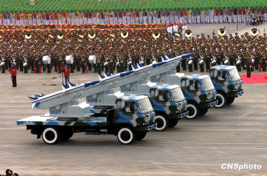 圖為1999年國慶閱兵式上海軍導(dǎo)彈方隊(duì)從天安門前走過。 中新社發(fā) 李剛 攝