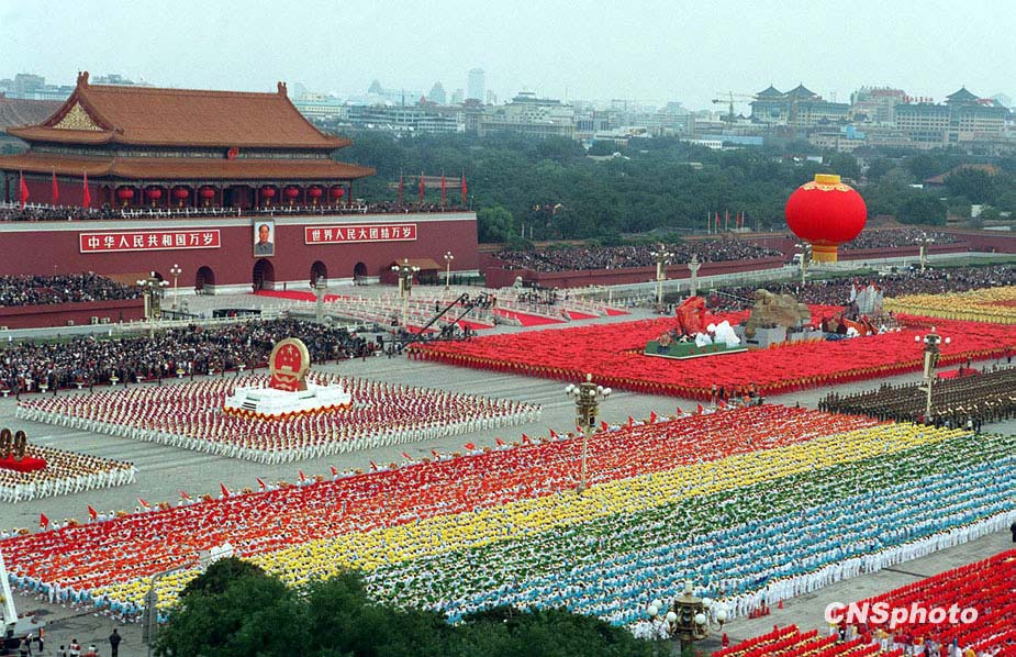 圖為參加1999年國(guó)慶慶典的群眾游行方陣和背景組字隊(duì)伍在天安門廣場(chǎng)上形成鮮艷的色塊效果。 中新社發(fā) 任晨鳴 攝