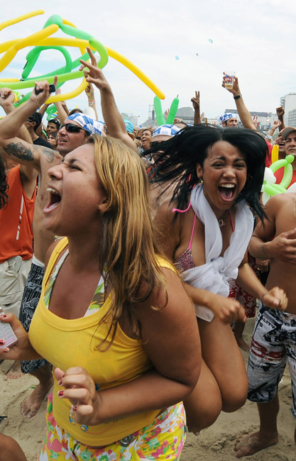 北京時間10月3日凌晨結束的2016年夏季奧運會舉辦城市投票中,巴西里約熱內盧經過三輪投票,擊敗馬德里、東京和芝加哥,成功獲得了2016年奧運會的主辦權。這將是現代奧林匹克運動自1894年首次在希臘舉辦之后,在一百多年的時間里首次來到南美洲大陸。圖為巴西民眾得知里約熱內盧獲得2016年奧運會主辦權后,在海灘上瘋狂歡慶。