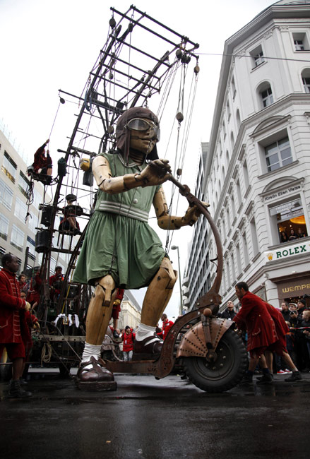 10月2日,來自法國一家戲劇公司的兩個巨型提線木偶亮相柏林街頭,它們將在露天劇場進行表演,以此紀念柏林墻推倒20周年。