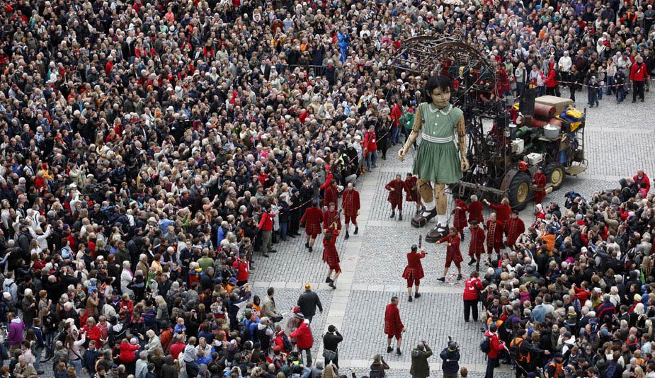 10月2日,來自法國一家戲劇公司的兩個(gè)巨型提線木偶亮相柏林街頭,它們將在露天劇場進(jìn)行表演,以此紀(jì)念柏林墻推倒20周年。