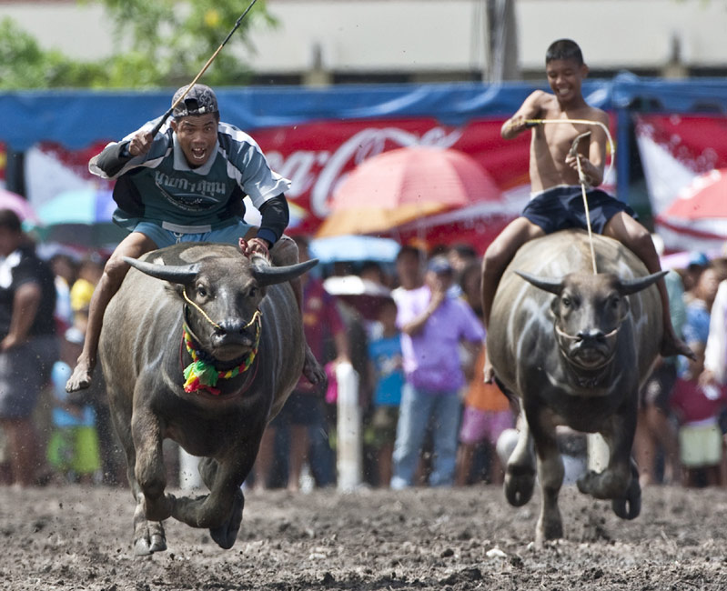 10月3日,泰國一年一度的騎水牛大賽在春武里舉行。