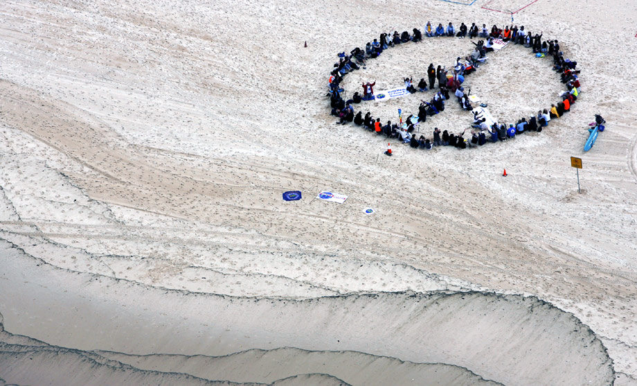 10月4日,一個在全球范圍內祈求和平的活動在多個國家展開,呼吁結束戰爭、消除核武器和結束各種暴力行為。在澳大利亞悉尼附近的海灘上,參加和平游行的人組成和平圖案。來源:中國新聞網