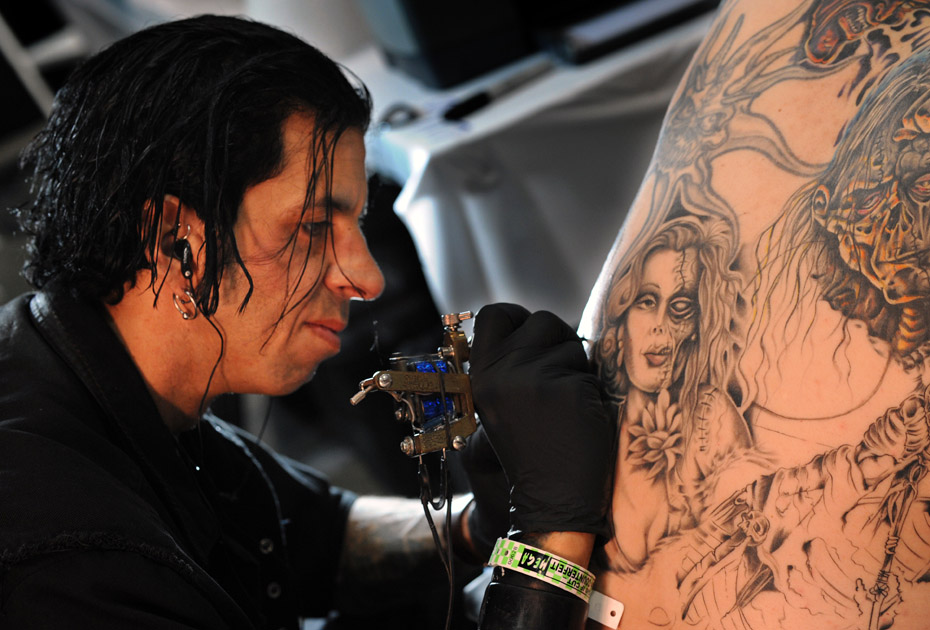 圖為觀眾在人體紋身藝術博覽會上紋身。