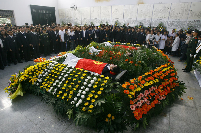 10月28日上午,湖北荊州市在市殯儀館舉行隆重追悼大會,悼念陳及時、何東旭、方招三位舍己救人大學生。數萬群眾趕到追悼會現場,手捧菊花為英雄道別。