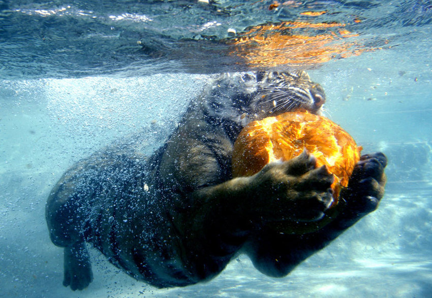 10月28日,美國加利福尼亞州Vallejo,六旗探索王國游樂園里的孟加拉虎在水下撕咬萬圣節(jié)南瓜。