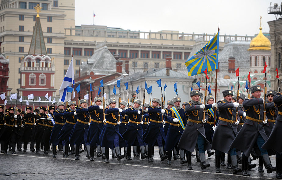 11月7日,俄羅斯士兵身穿二戰時期的軍服在莫斯科紅場舉行閱兵閱兵式紀念1941年紅場閱兵。圖片來源:中國新聞網