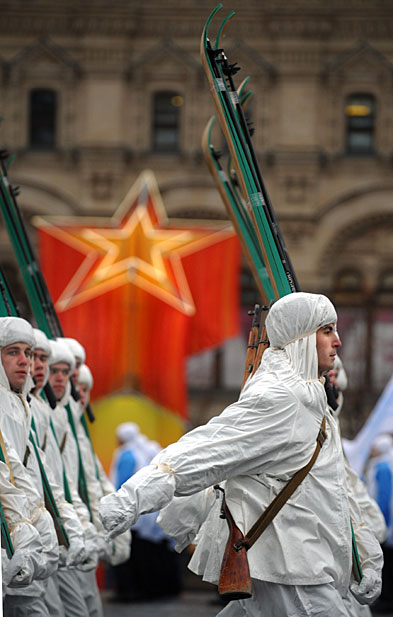 11月7日,俄羅斯士兵身穿二戰時期的軍服在莫斯科紅場舉行閱兵閱兵式紀念1941年紅場閱兵。圖片來源:中國新聞網
