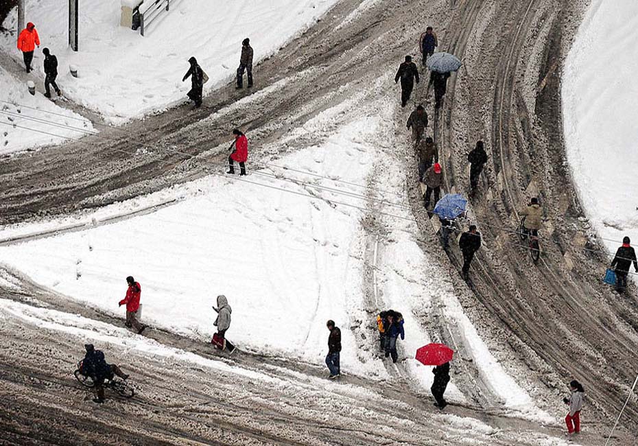 11月12日晨,鄭州市民在市區一個路口的機動車道上匆匆行走。 連續的降雪使河南鄭州市區道路積雪較厚,許多地段還有折斷的樹木擋路,給市民出行帶來不便,很多人只得選擇步行或騎自行車上班。 新華社記者王頌攝 (來源:新華網)