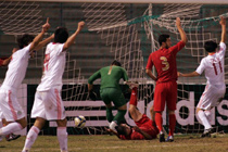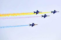 慶祝中國人民解放軍空軍成立60周年飛行表演,11月15日上午在北京沙河機場舉行。表演按八一飛行表演隊4架殲-10飛機表演12個動作和6架殲-7GB飛機表演15個動作,分四機對頭交叉、四機菱形隊大坡度盤旋、單機小速度平飛等27個動作,其中四機對頭交叉動作是這次表演中技術難度較大的動作之一,這是國產三代飛機和國產二代飛機首次同場競技表演。圖為殲-7GB表演六機向下開花。中新社發 宋吉河 攝