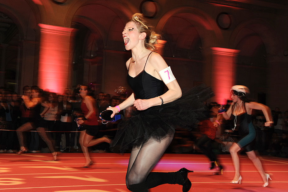11月20日,法國巴黎舉行了有趣的室內高跟鞋賽跑比賽,總共32支隊伍96人一爭高下。圖片來源:中國新聞網