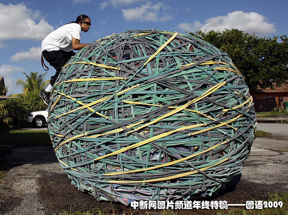 世界最大的橡皮筋球:10月23日,美國佛羅里達州青年喬爾終于完成了他的作品——世界上最大的橡皮筋球。圖片來源:中國新聞網