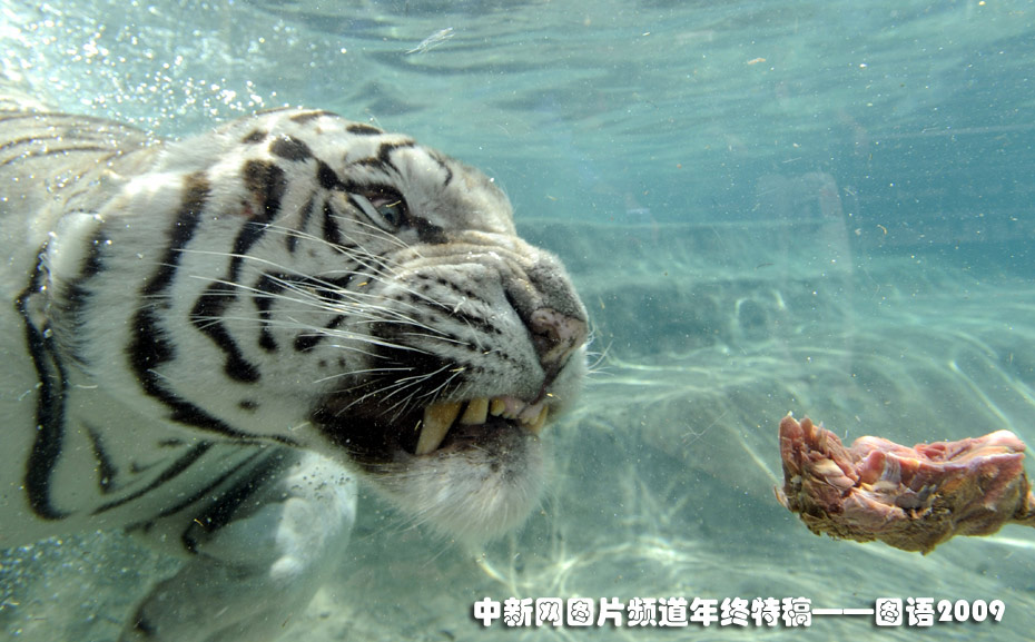 美國加利福尼亞,一只名叫奧丁的雄性孟加拉大白虎在水中“覓食”。它不僅一點也不怕水,而且出眾的游泳技能聞名。