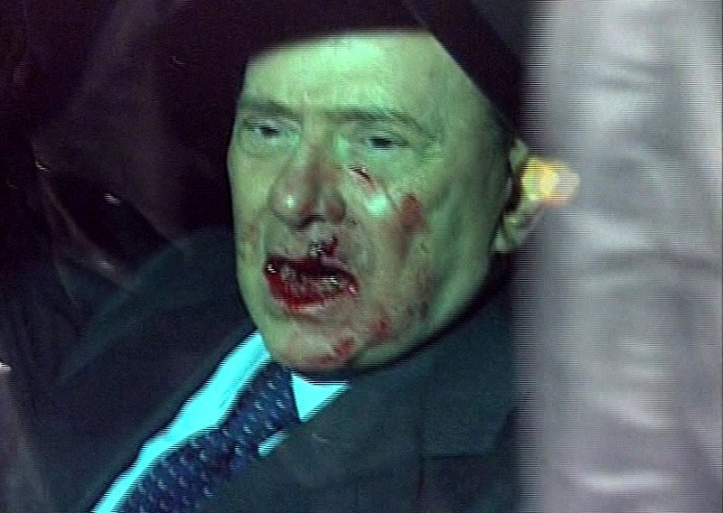 意大利總理貝盧斯科尼13日晚間受邀在米蘭參加一個集會時遭到襲擊,面部受傷流血,隨后被緊急送醫治療。圖片來源:中國新聞網