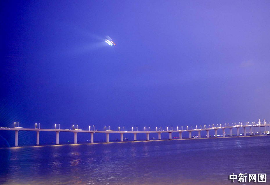 直升機飛過澳門友誼大橋。中新社記者 廖攀 攝