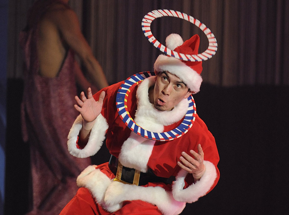 12月19日,在日本東京一家劇院,身著圣誕老人服裝的退役的奧運會選手參加“肌肉音樂劇”預演,展示其過人的身體素質與運動技巧。圖片來源:中國新聞網