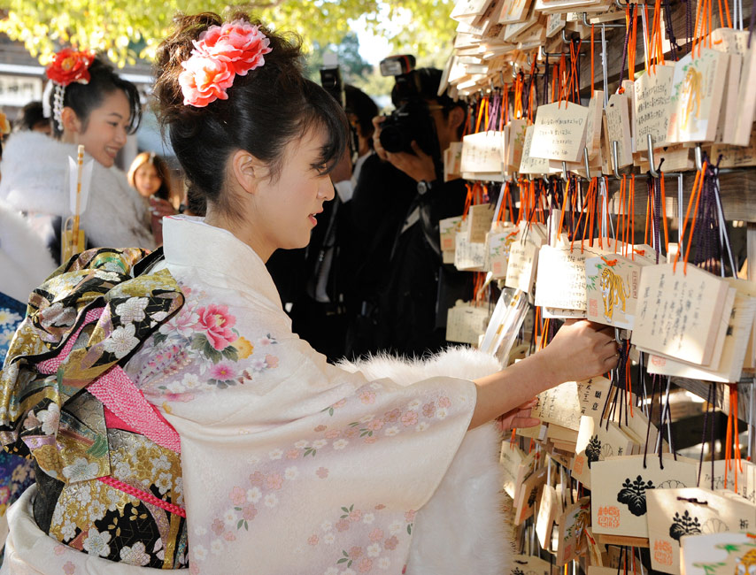 今年的1月11日,是日本傳統的成人節,所有滿20歲的年輕人將宣告自己邁進了成人行列。1月8日,日本一家公司年滿20歲的年輕女孩紛紛穿上和服,到廟宇中祈福,提前慶祝成人節的到來。
