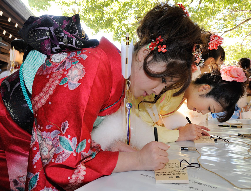 今年的1月11日,是日本傳統的成人節,所有滿20歲的年輕人將宣告自己邁進了成人行列。1月8日,日本一家公司年滿20歲的年輕女孩紛紛穿上和服,到廟宇中祈福,提前慶祝成人節的到來。