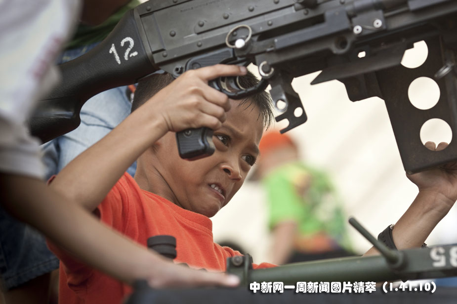 1月9日(周六),當天是泰國的兒童節,一名男孩正在體驗沒有裝彈的機槍。圖片來源:中國新聞網