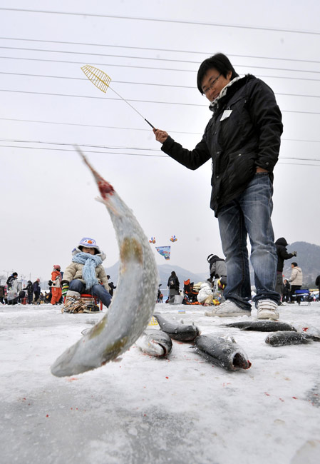 2010年1月9日,韓國華川郡,一年一度的華川山鱒魚節當日舉行。數千游客在此“破冰”比賽釣鱘魚。該活動每年都會吸引上百萬游客前來。
