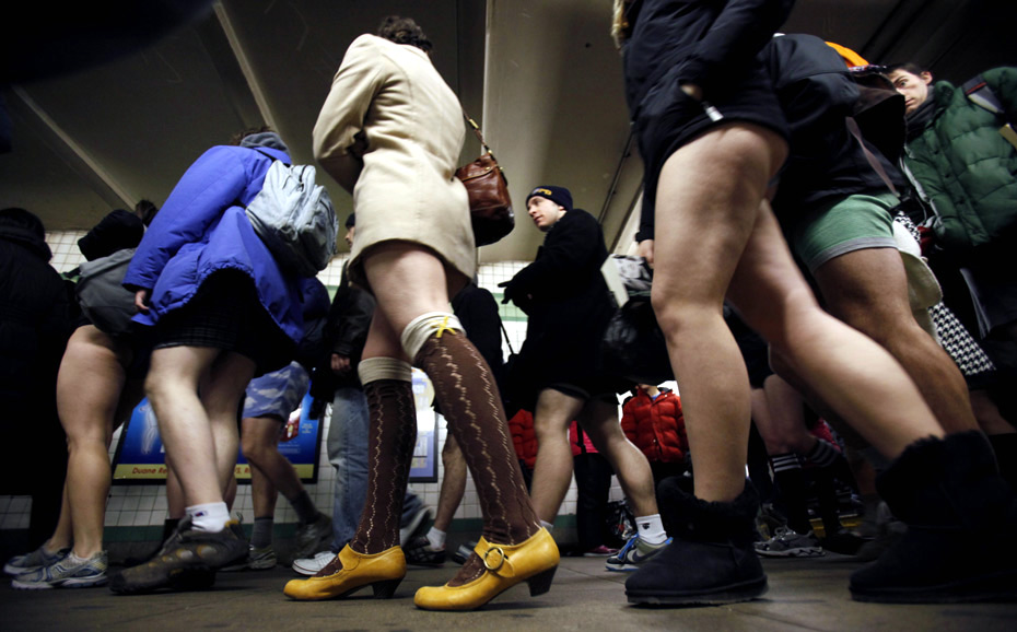 2010年1月10日,紐約,地鐵里一群不穿褲子的乘客。第9屆“不穿褲子乘地鐵”活動當日在全球16個國家的44座城市舉行。圖片來源:中國新聞網