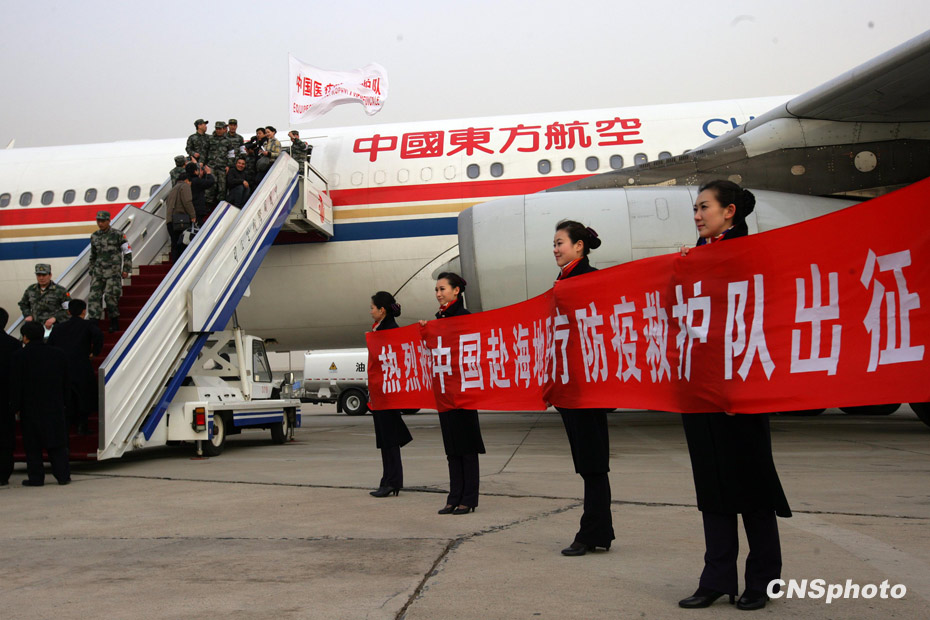 1月24日18時,由中國人民解放軍醫護人員和管理人員組成的中國醫療防疫救護隊一行40人乘坐軍運包機離開北京,啟程前往海地進行人道主義救援任務。