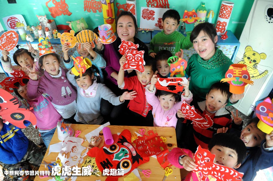 1月13日,北京西城區一所幼兒園的小朋友在老師帶領下制作各種各樣的老虎。他們用舊報紙、碎布條等廢舊材料制作成各種構思奇妙、栩栩如生的手工制品,迎接即將到來的農歷虎年。中新社發 遠舟 攝