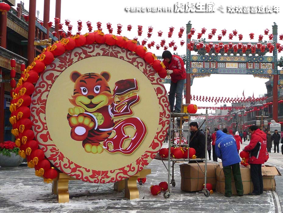 2月7日,兩個直徑3米左右的巨型“虎鼓”景觀亮相北京前門大街,與萬盞大紅燈籠交相輝映構成一道充滿喜慶氛圍的靚麗風景,盛裝迎接虎年新春的到來。中新社發 玉龍 攝