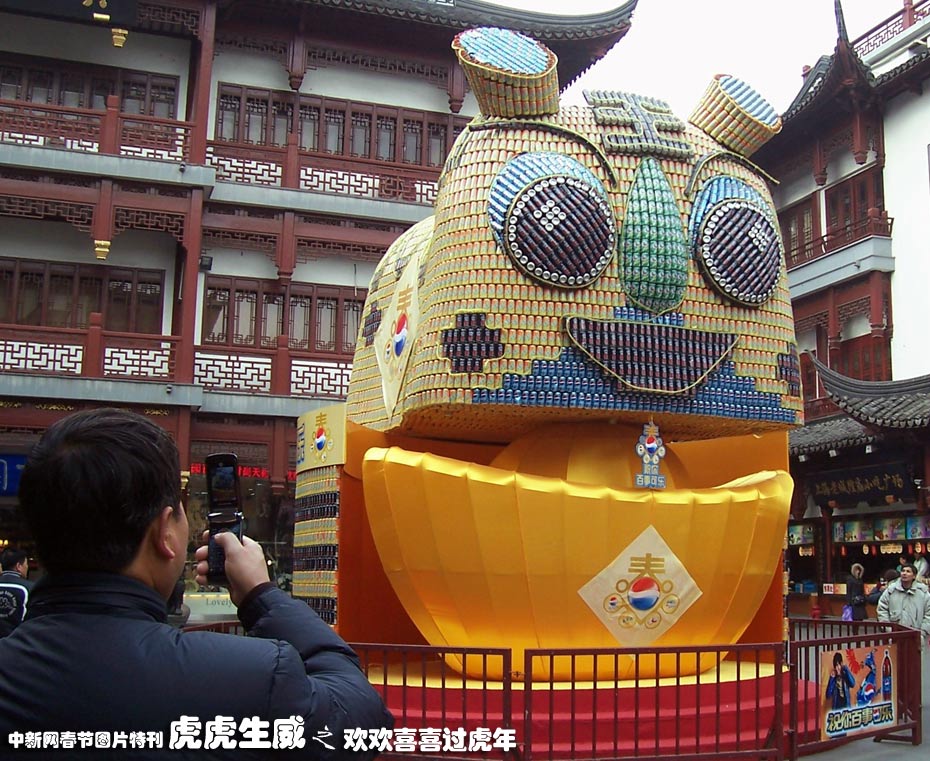 1月5日,一只用數(shù)萬個(gè)易拉罐搭成的高達(dá)七米的卡通虎亮相上海豫園商城廣場,迎接虎年新春的到來,吸引中外游客觀賞留影。中新社發(fā) 周東潮 攝