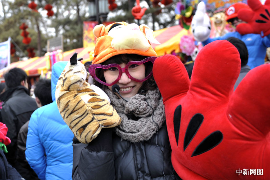 2月14日,農歷正月初一,北京各大傳統廟會、洋廟會爭相開幕,許多游客頭戴虎年飾品開心游廟會。中新網記者 金碩 攝