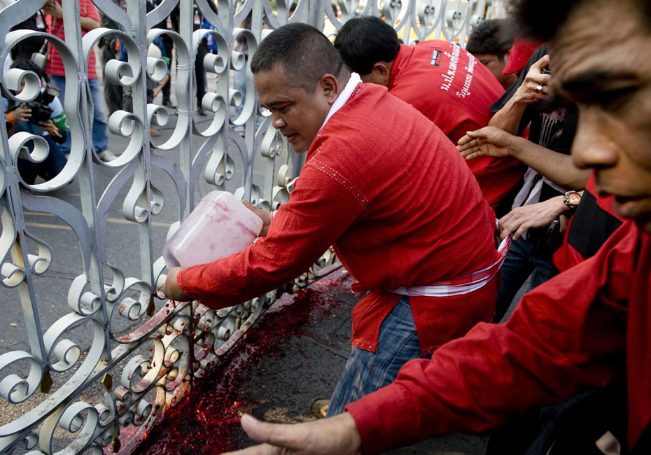 泰國反政府組織“紅衫軍”成員將血液潑灑在曼谷總理府門前,以此向政府施壓要求解散國會下議院。圖片來源:中國新聞網