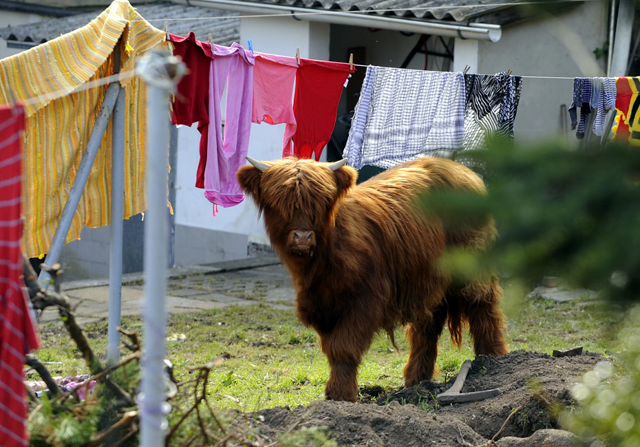 3月18日,德國一頭蘇格蘭高地牛來到一居民院內懶洋洋的曬太陽,最后經過獸醫的麻醉和消防員協力才將這頭蠻力十足的家伙“制服”。圖片來源:中國新聞網