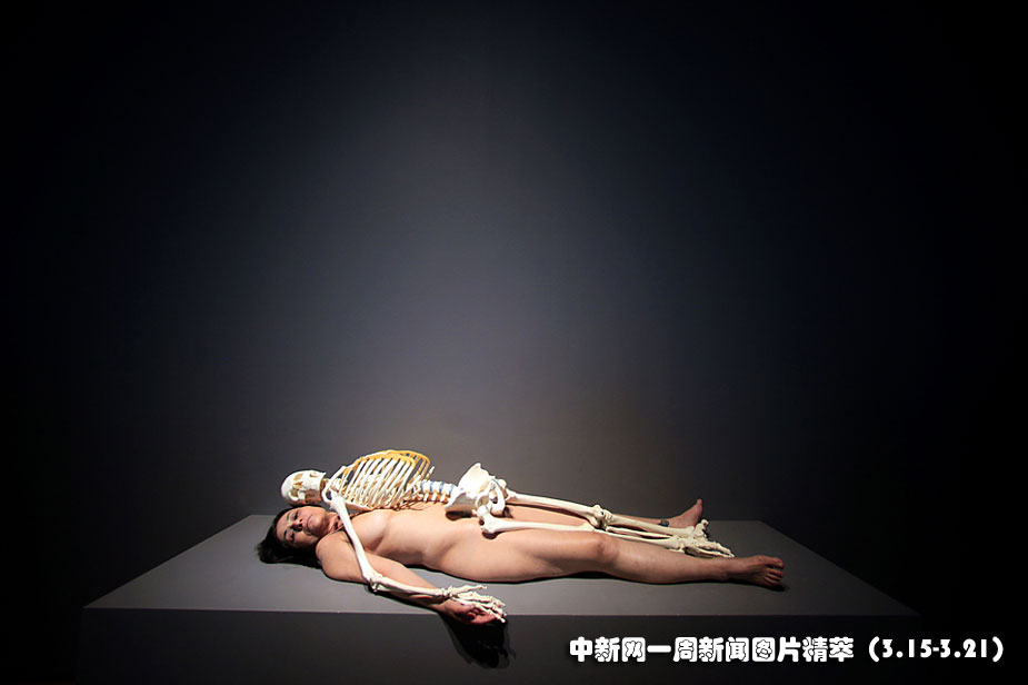 15日(周一),在紐約現代藝術館舉行的展覽“瑪麗娜阿布拉莫維奇:藝術家在場”上,一名女子展示作品“與骷髏一起裸體”。