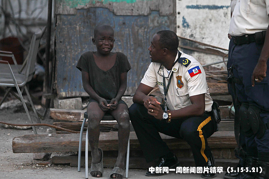 15日(周二),海地,警方正在向一名目擊了太子港貧民窟槍戰的兒童詢問情況。