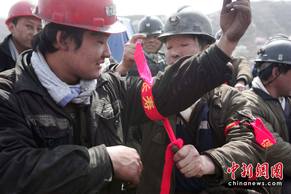 4月4日,華晉焦煤公司王家?guī)X礦透水事故第八天,搶險指揮部組成120人的救援大隊下井,他們將在井下對獲救礦工進行緊急救援。圖為救援人員在胳膊上綁著象征長壽平安的紅腰帶。中新社發(fā) 張云 攝