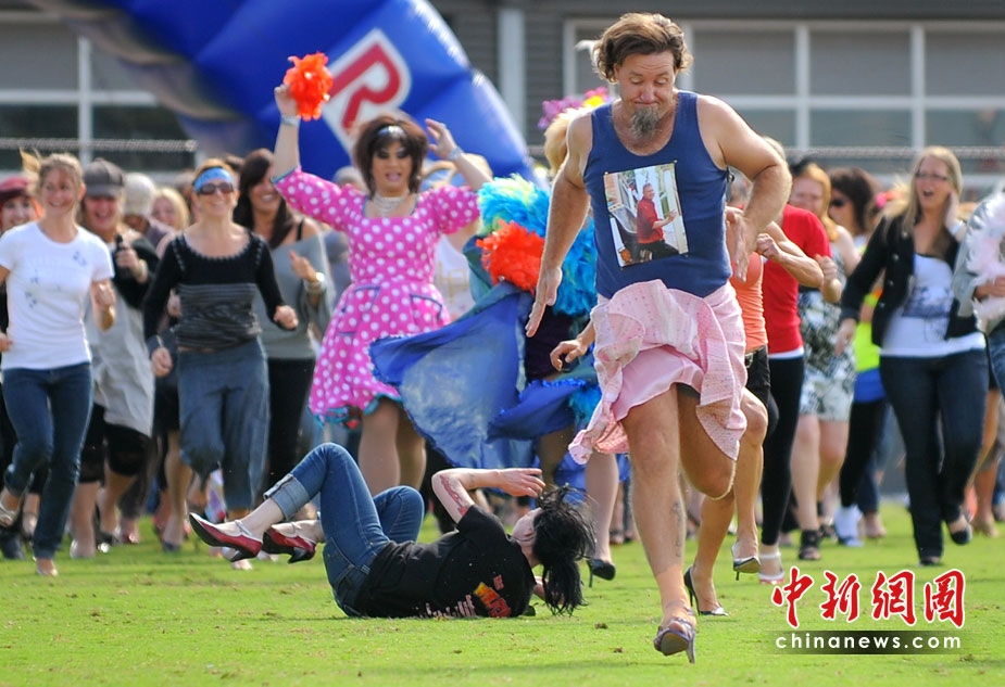 4月10日,在澳大利亞墨爾本,人們穿著高跟鞋賽跑。旨在挑戰(zhàn)多人穿高跟鞋賽跑的吉尼斯世界紀錄。盡管最終挑戰(zhàn)失敗,參賽者仍在80米的賽道上爭先恐后,各顯神通。