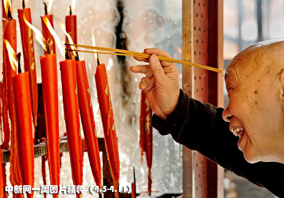 每年清明節(jié)時(shí),中國人會(huì)去墓地和寺廟焚香燒紙來表示對(duì)祖先的敬意。照片攝于4月5日周一,圖中這位上海老人正在寺廟里燒香祭祖。
