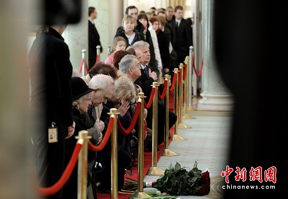 當地時間4月13日14時,波蘭總統夫婦的遺體被安放在總統府最大的圓柱廳供民眾瞻仰和悼念。總統卡欽斯基及其夫人的葬禮將于18日舉行。圖片來源:中國新聞網