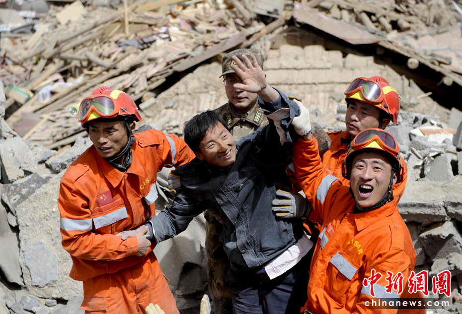 圖為4月15日12時,一位幸存者被中國國際地震救援隊在青海玉樹縣結(jié)古鎮(zhèn)西北牛賓館廢墟中救出,他微笑著揮動手臂。中新社發(fā) 廖攀 攝
