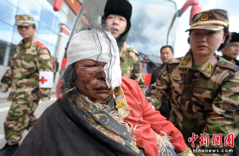 圖為4月15日下午,玉樹地震重傷員用各種交通工具送達機場,廣東邊防總隊醫療救援隊,用被褥接轉傷員。中新社發 陳文 攝