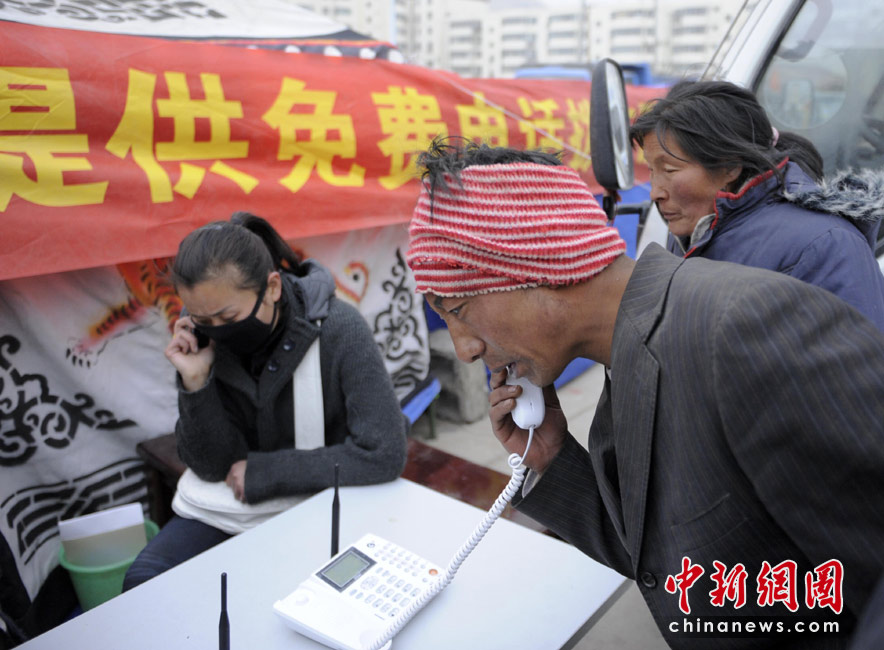 4月16日,青海玉樹體育場地震受災民眾安置點,民眾撥打有關部門安裝的免費電話報平安。 中新社發 廖攀 攝
