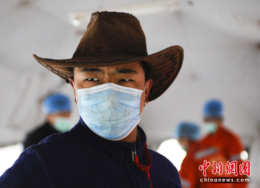 4月16日,青海玉樹體育場武警醫院醫療隊帳篷里,一名戴著紅絲帶的志愿者幫助醫務人員展開救援。 中新社發 廖攀 攝