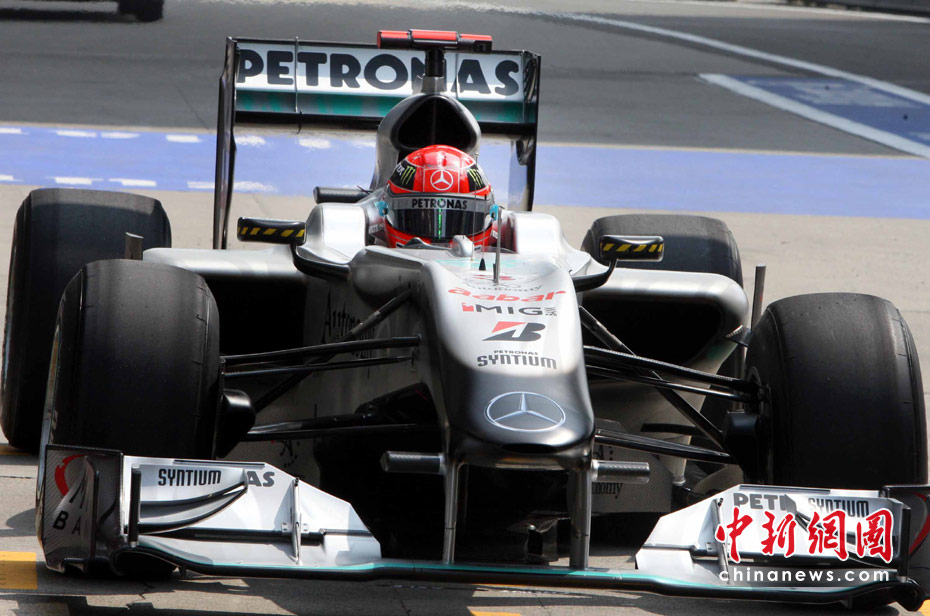 4月16日,2010國際汽聯(lián)F1世界錦標(biāo)賽上海站在上海國際賽車場開始車手第一、第二次練習(xí)賽。圖為代表梅賽德斯GP車隊(duì)出戰(zhàn)的老車王、德國車手舒馬赫重回上海賽道。 中新社記者 任晨鳴 攝