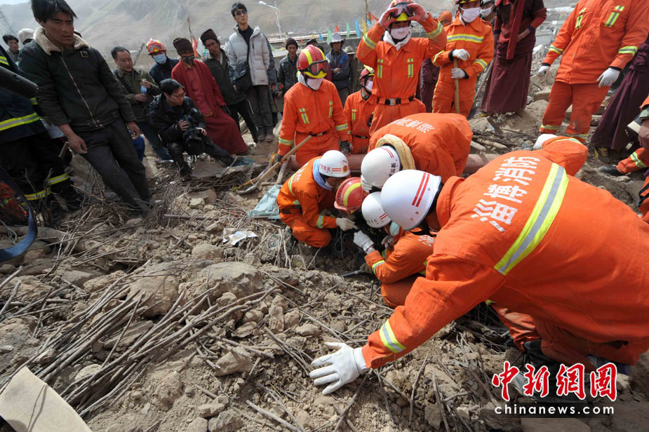 4月16日,青海玉樹地震救援進入第三天,來自蘭州軍區、山東消防特勤、重慶特勤、廣東邊防總隊、云南邊防總隊、青海民兵等搜救隊連續搜救,幸存者奇跡生還。中新社發 陳文 攝