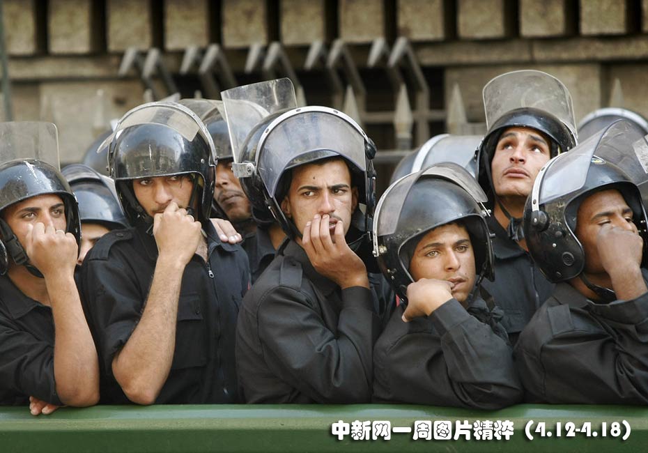 4月13日周二,埃及開羅市中心一支安全部隊封鎖示威者。