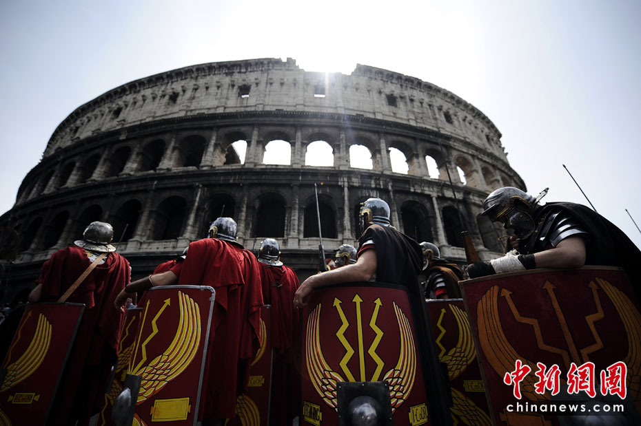 4月18日,意大利羅馬,男子打扮成武士在圓形競技場附近參加游行,慶祝羅馬建城2763周年。圖片來源:中國新聞網