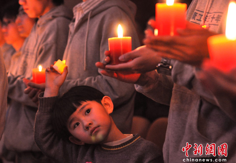 4月19日晚,著名音樂人郭峰在北京清華大學舉辦了“祈福——情系玉樹災區”現代流行鋼琴燭光音樂會,這是文藝界為抗震救災特獻的首個公益演出。郭峰用鋼琴演奏了《聽海》、《真心英雄》、《心會跟愛一起走》、《堅強的心》、《希望的陽光》等多首主調凝重、祈福、激勵、昂揚的樂曲,F場觀眾是來自首都各大高校的大學生們,他們手中搖曳著燭光,眼含熱淚,在音樂的旋律中為災區祈福。圖為一位小朋友和大學生們一起點起了燭光。中新社發 李學仕 攝