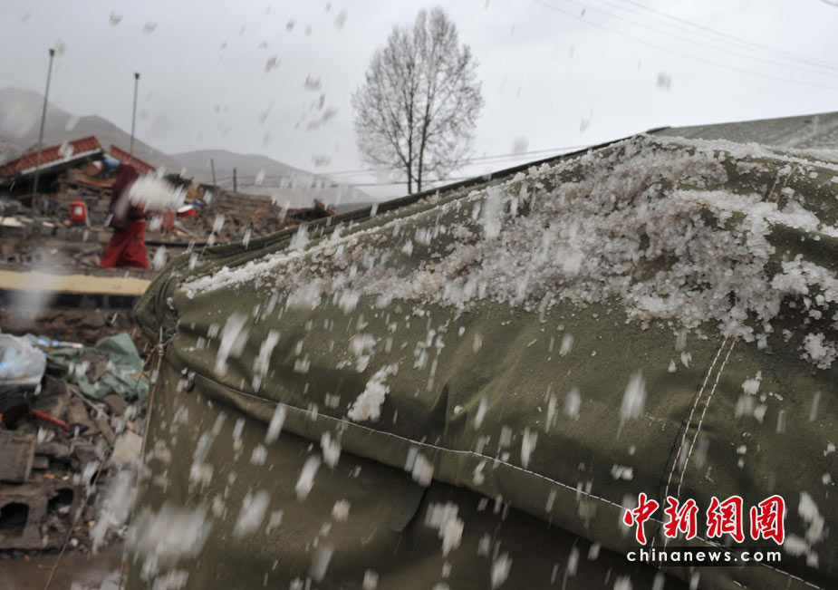 4月20日12時許,青海玉樹地震災區天氣突變,雷雹交加,為抗震救災造成相當困難。中新社發 賈國榮 攝
